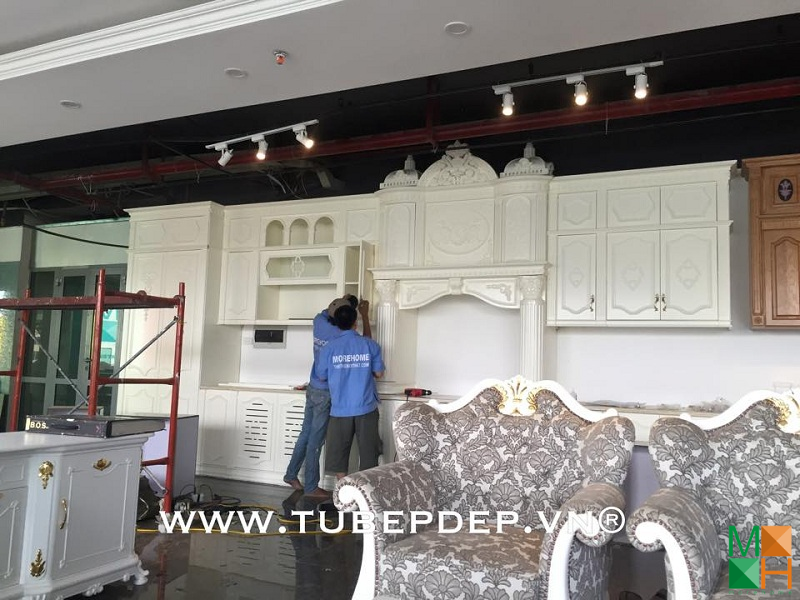 Thi công tủ bếp cổ điển tại siêu thị NOI THAT MOREHOME nổi bật với sắc trắng kết hợp cùng họa tiết cổ điển ấn tượng